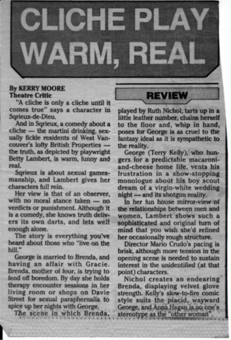 "The roots of Lambert's work lay in the black comedy traditions of Edward Albee. Lambert, however, changed the motif to outrageous, hard-hitting, straight hilarity. Rather than a bad imitation of the absurd, Lambert has scored brilliantly by trusting to a comic style linked to her own instincts."